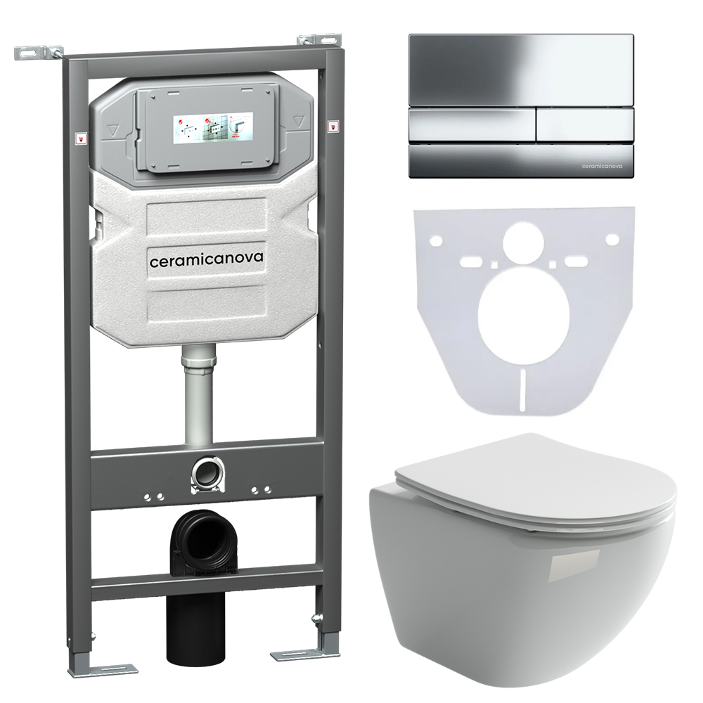 Сет 4 в 1: подвесной унитаз metropol rimless арт. cn4002 + шумоизоляционная панель для инсталляции арт. cn1000 + система инсталляции для унитазов ceramicanova envision с кнопкой смыва flat цвет хром, креплениями, арт. cn1002ch