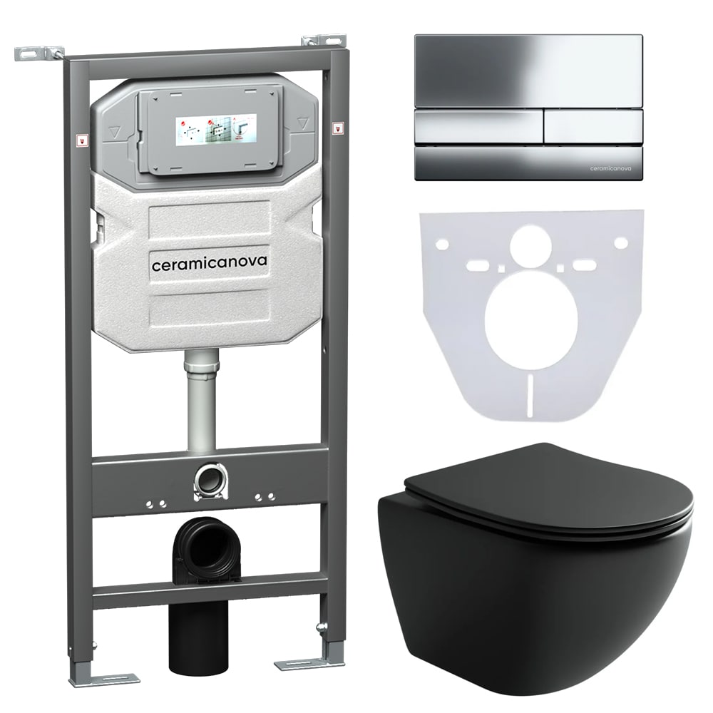Сет 4 в 1: подвесной унитаз metropol rimless арт. cn4002mb + шумоизоляционная панель для инсталляции арт. cn1000 + система инсталляции для унитазов ceramicanova envision с кнопкой смыва flat цвет хром, креплениями, арт. cn1002ch