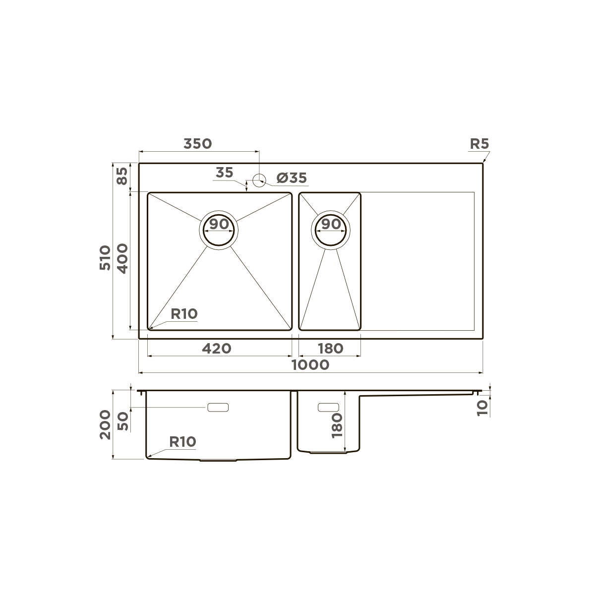 Кухонная мойка omoikiri akisame 100-2-l-in нерж. сталь/нержавеющая сталь 1000 x 510 x 200
