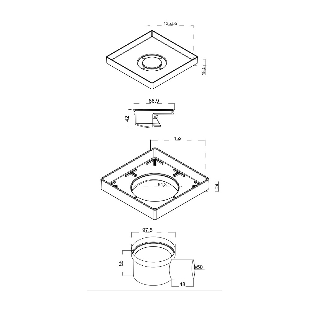 Трап berges водосток напольный trend keramik 150*150 под керамическую плитку, d50 боковой