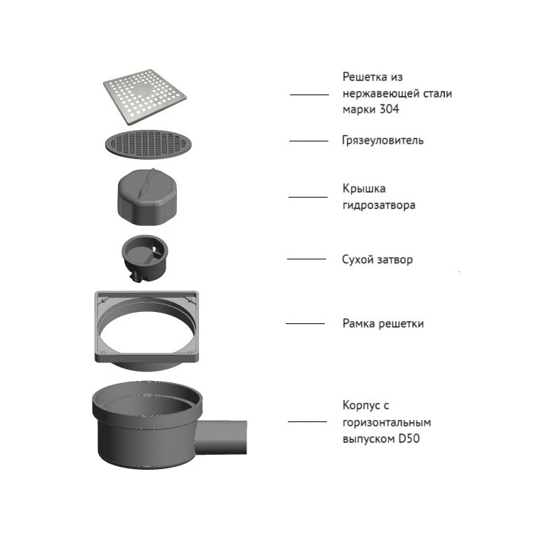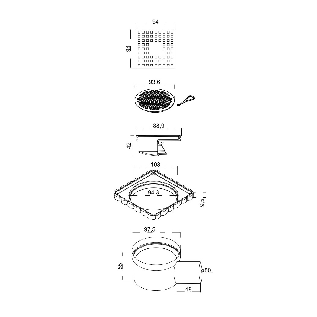Трап berges водосток напольный trend 100x100 нержавеющая сталь, хром глянец, d50 боковой
