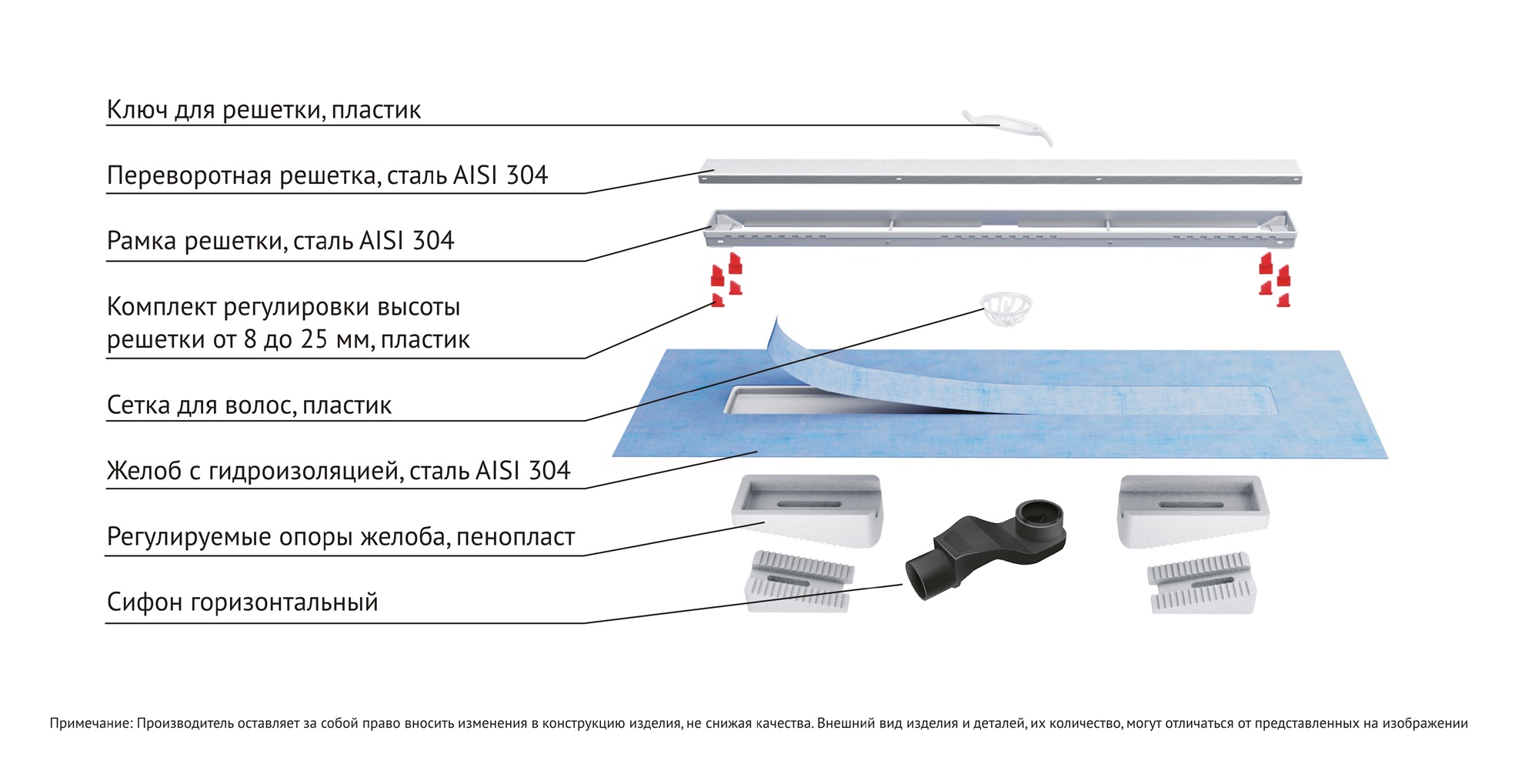 Усовершенствованная система настройки высоты изделия позволяет выполнить легкую регулировку под заданную толщину покрытия, с минимальной высотой монтажа (заливки) - 65мм.