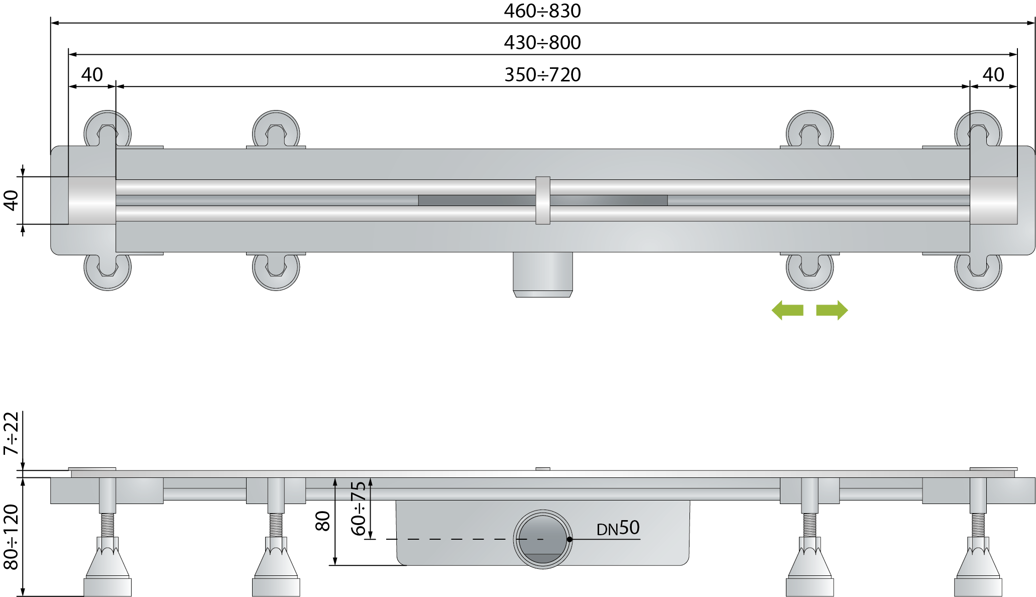 Дренажный канал 120 см, подрезаемый, гидрозатвор, abs, горизонтальный выход omp tea sumisura 983.401.8.n, оружейная сталь