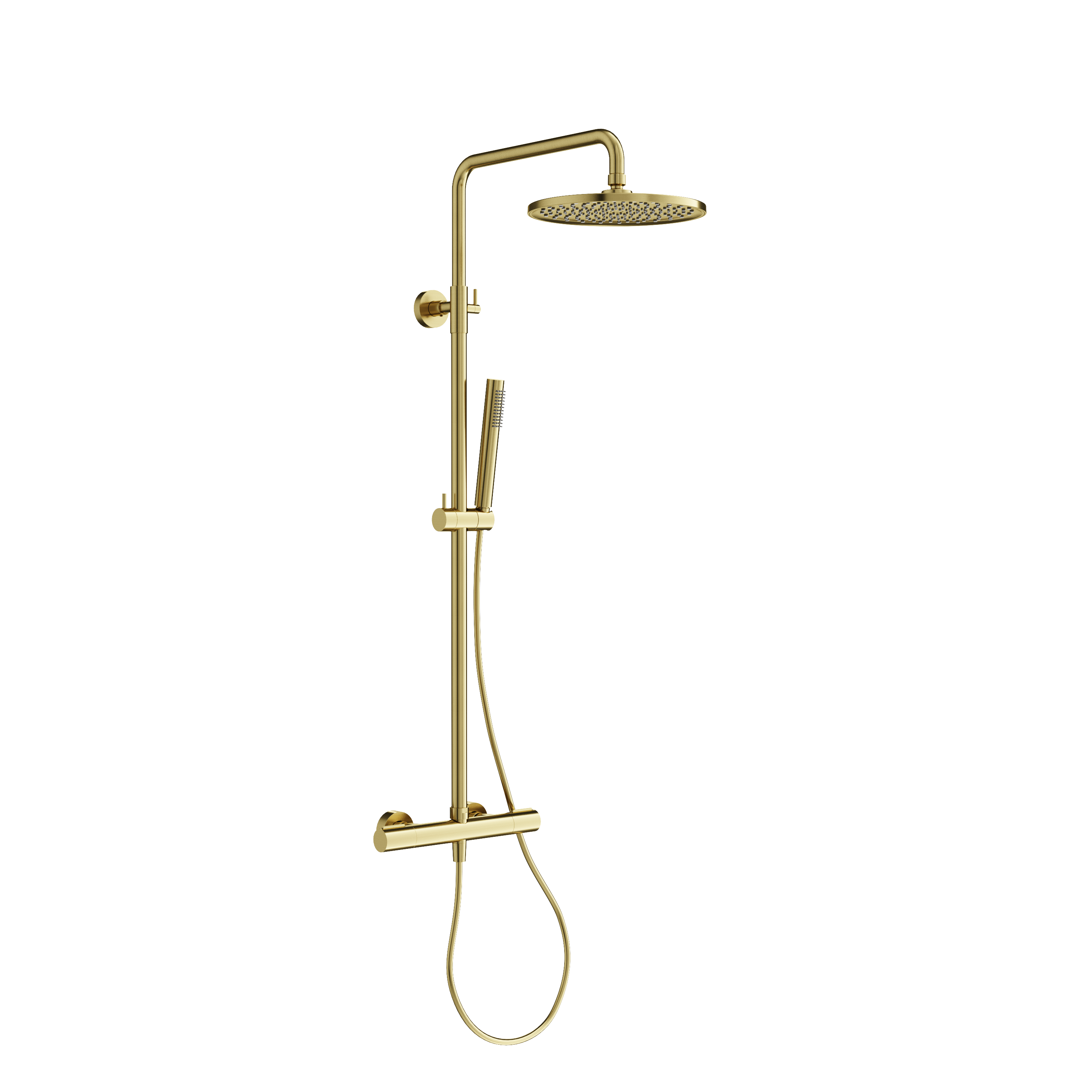 Душевая стойка со встроенным термостатом; Термостат со высокочувствительным катриджем SEDAL (Испания) мгновенно настраивает желаемую температуру воды; Предустановленный ограничитель температуры при 40°; Интегрированный в корпус смесителя переключатель потоков воды; Система защиты от ожогов при отключении холодной воды; Встроенный клапан защиты от обратного потока: Верхний душ 250 мм с возможностью настройки наклона; Ручной душ 125 мм , з режима с кнопкой переключения; Гибкий шланг с системой защиты от перекручивания - 1,5 м , материал - пластик; Цвет брашированное золото