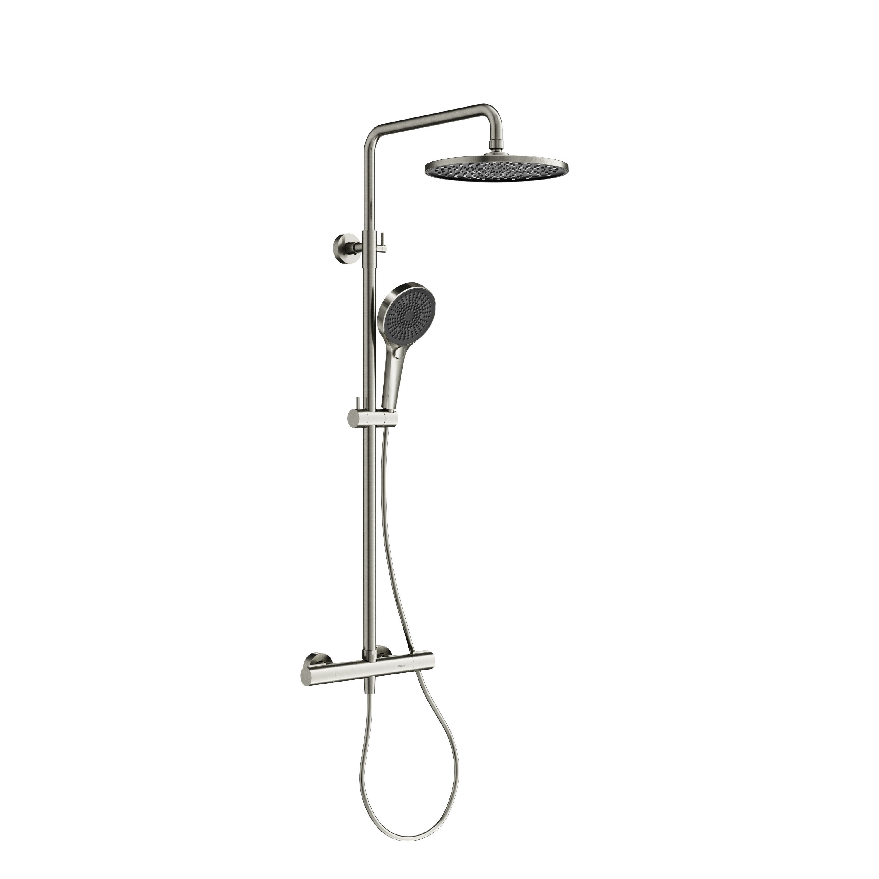 Душевая стойка со встроенным термостатом; Термостат со высокочувствительным катриджем SEDAL (Испания) мгновенно настраивает желаемую температуру воды; Предустановленный ограничитель температуры при 40°; Система защиты от ожогов при отключении холодной воды; Встроенный клапан защиты от обратного потока: Интегрированный в корпус смесителя переключатель потоков воды; Возможность регулировки штанги по высоте; Верхний душ 250 мм с возможностью настройки наклона; Ручной душ пластик, 3 режима; Гибкий шланг с системой защиты от перекручивания - 1,5 м , материал - пластик; Экстра прочное покрытие PVD; Цвет Брашированный никель
