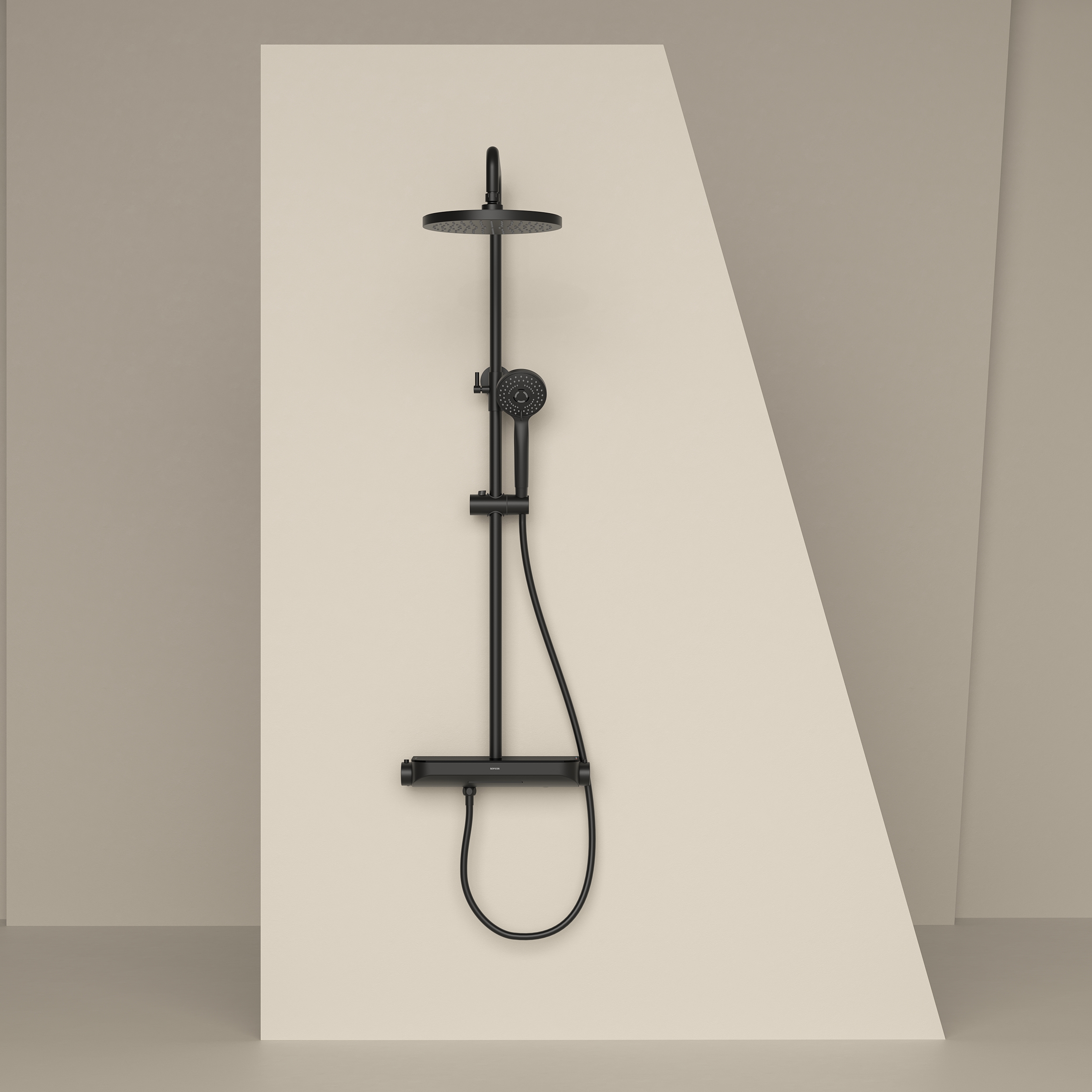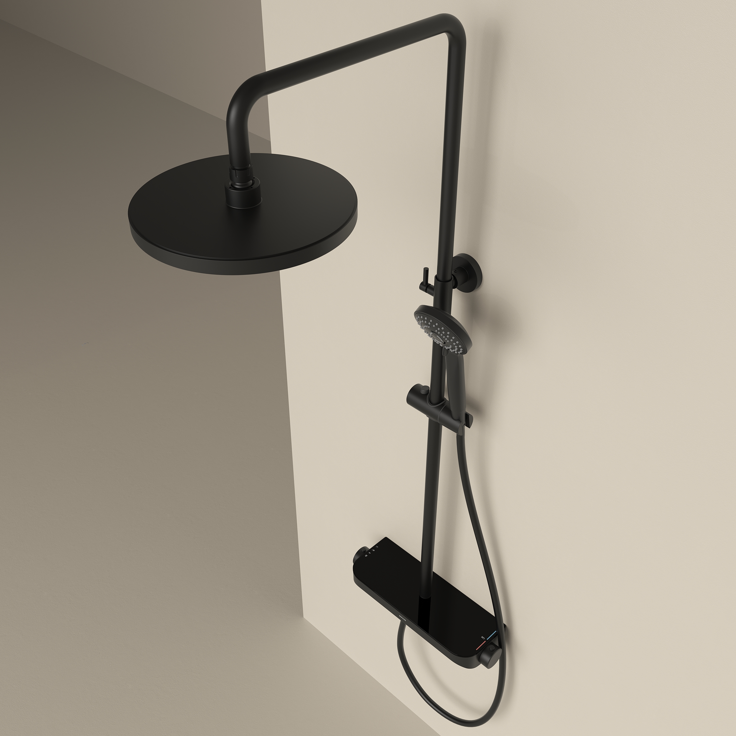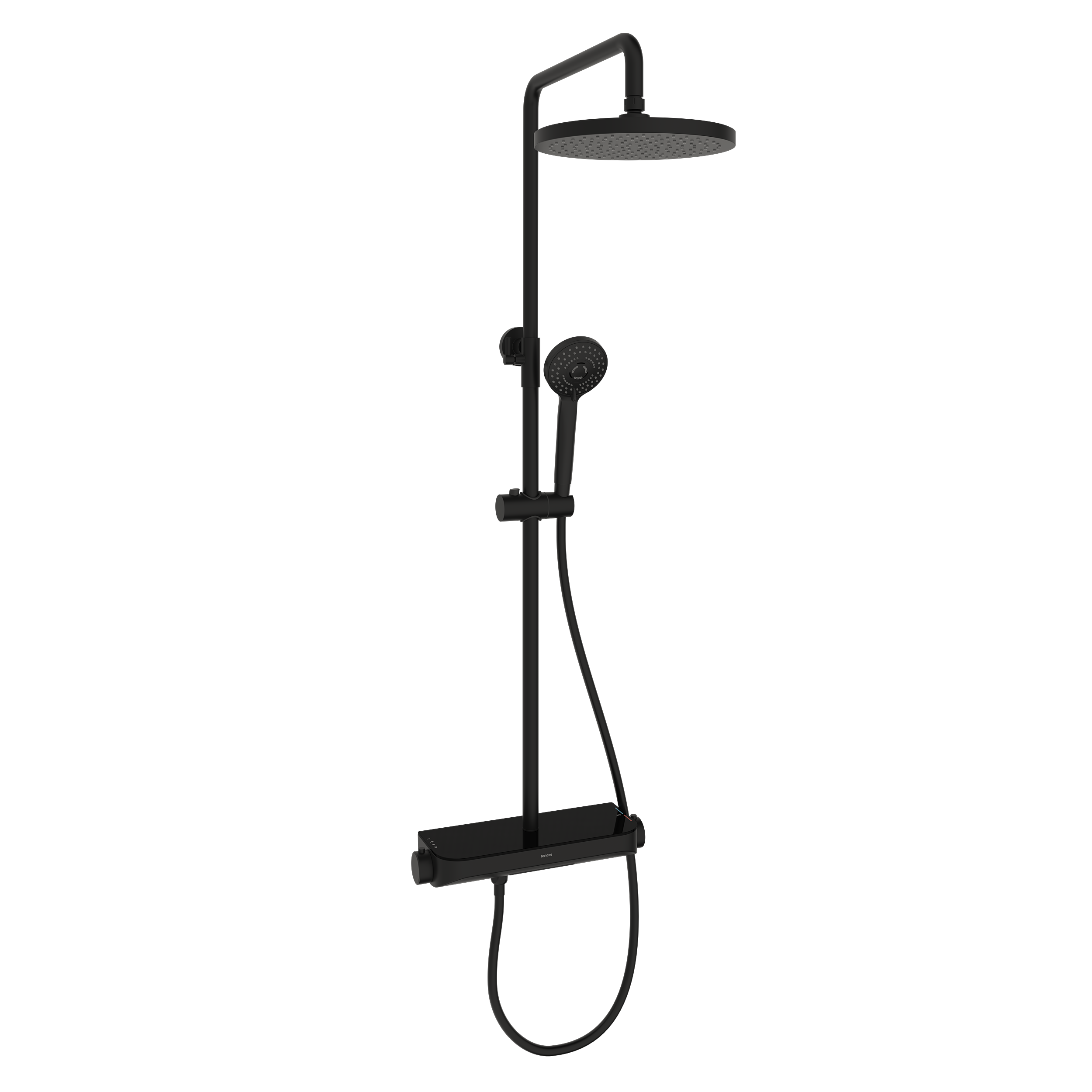 Душевая стойка Sancos Teo c термостатом, встроенным изливом, полкой и с регулировкой по высоте штанги, цвет черный матовый, арт. SC11002MB