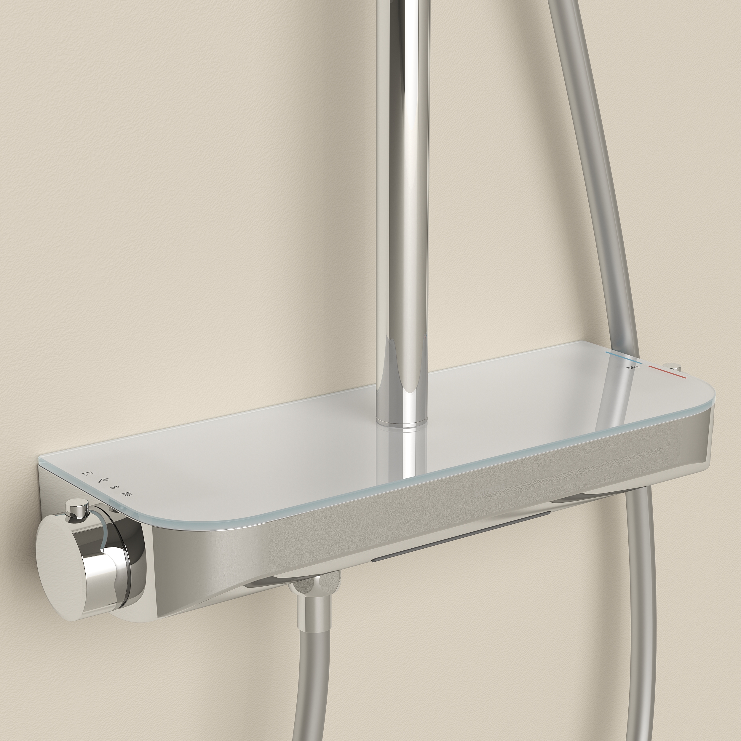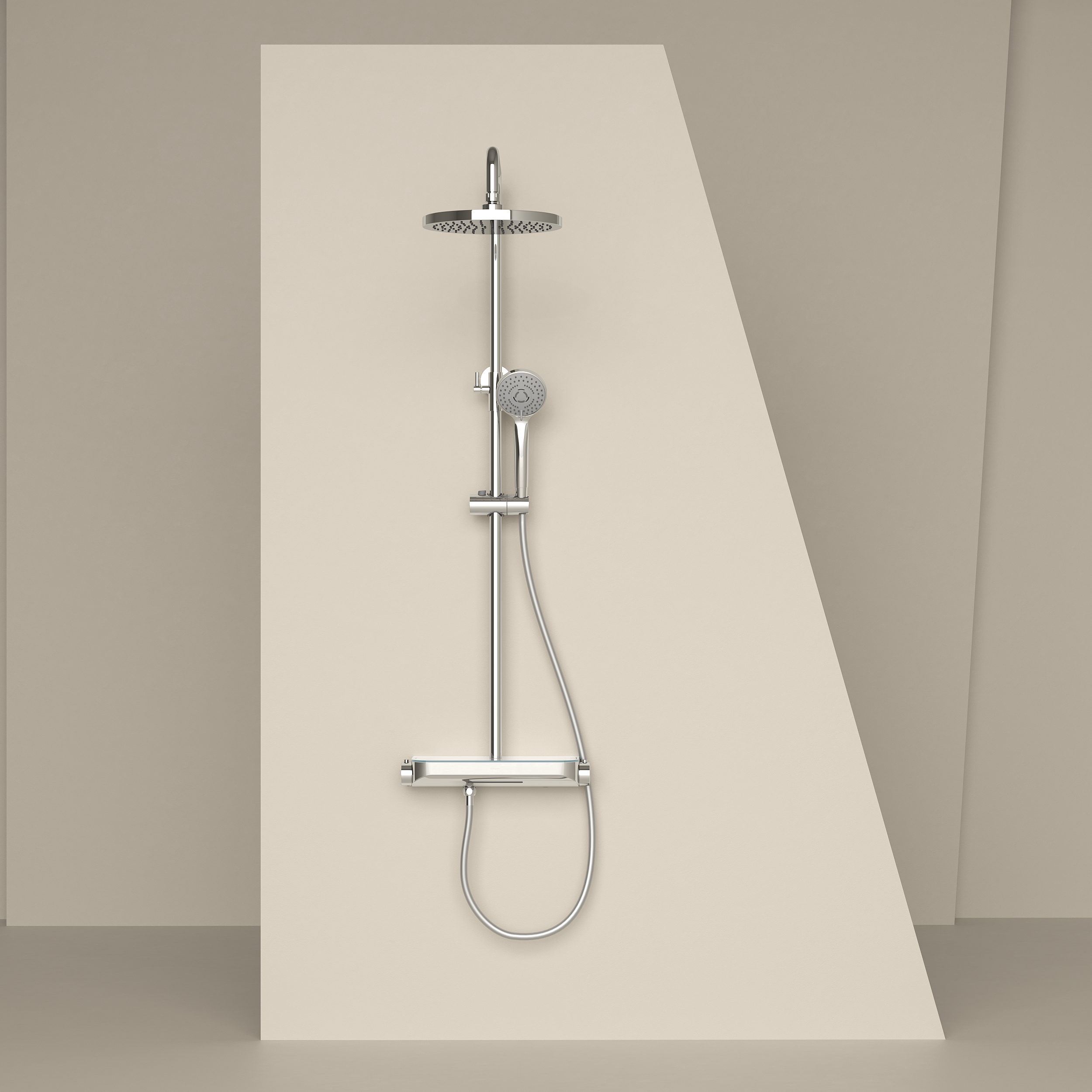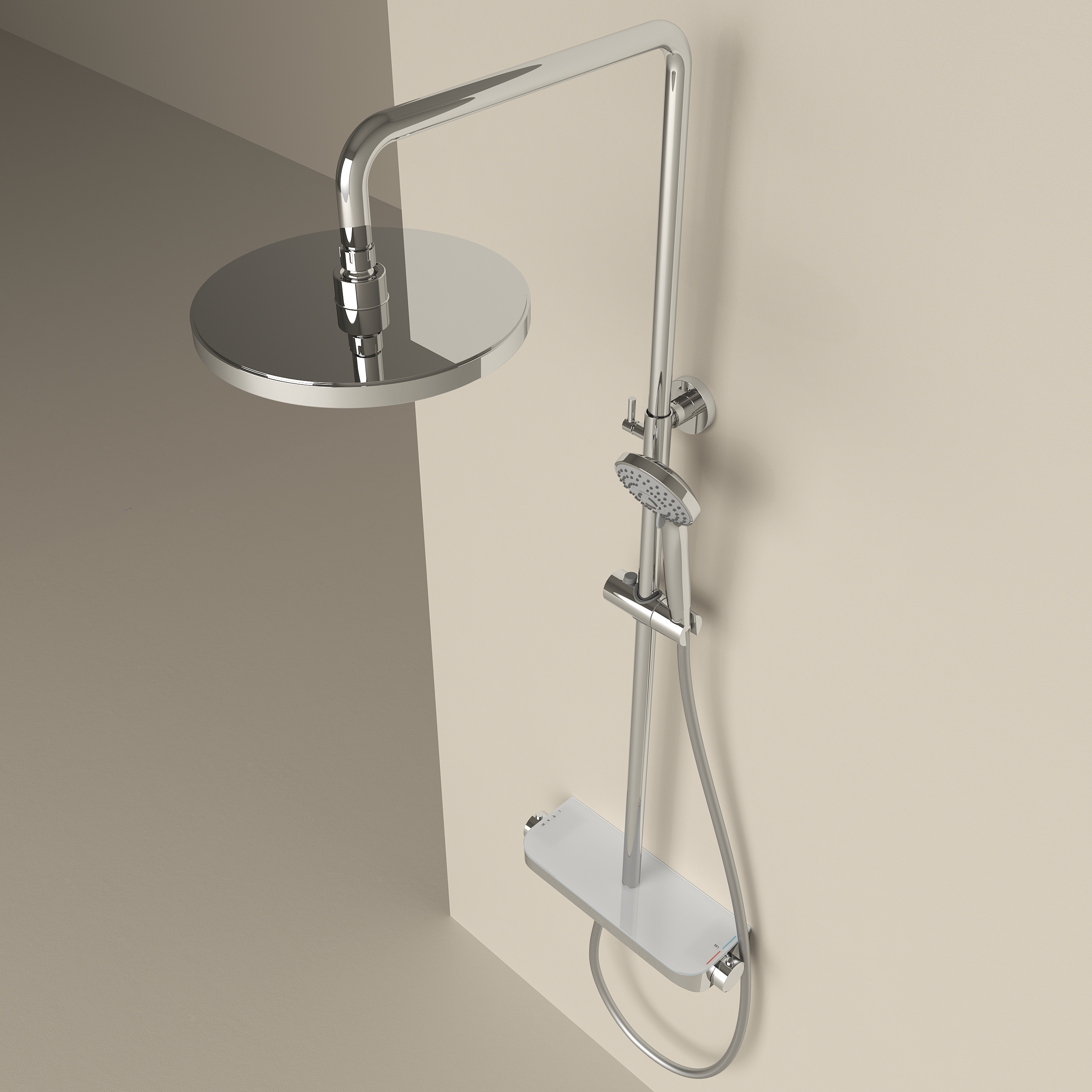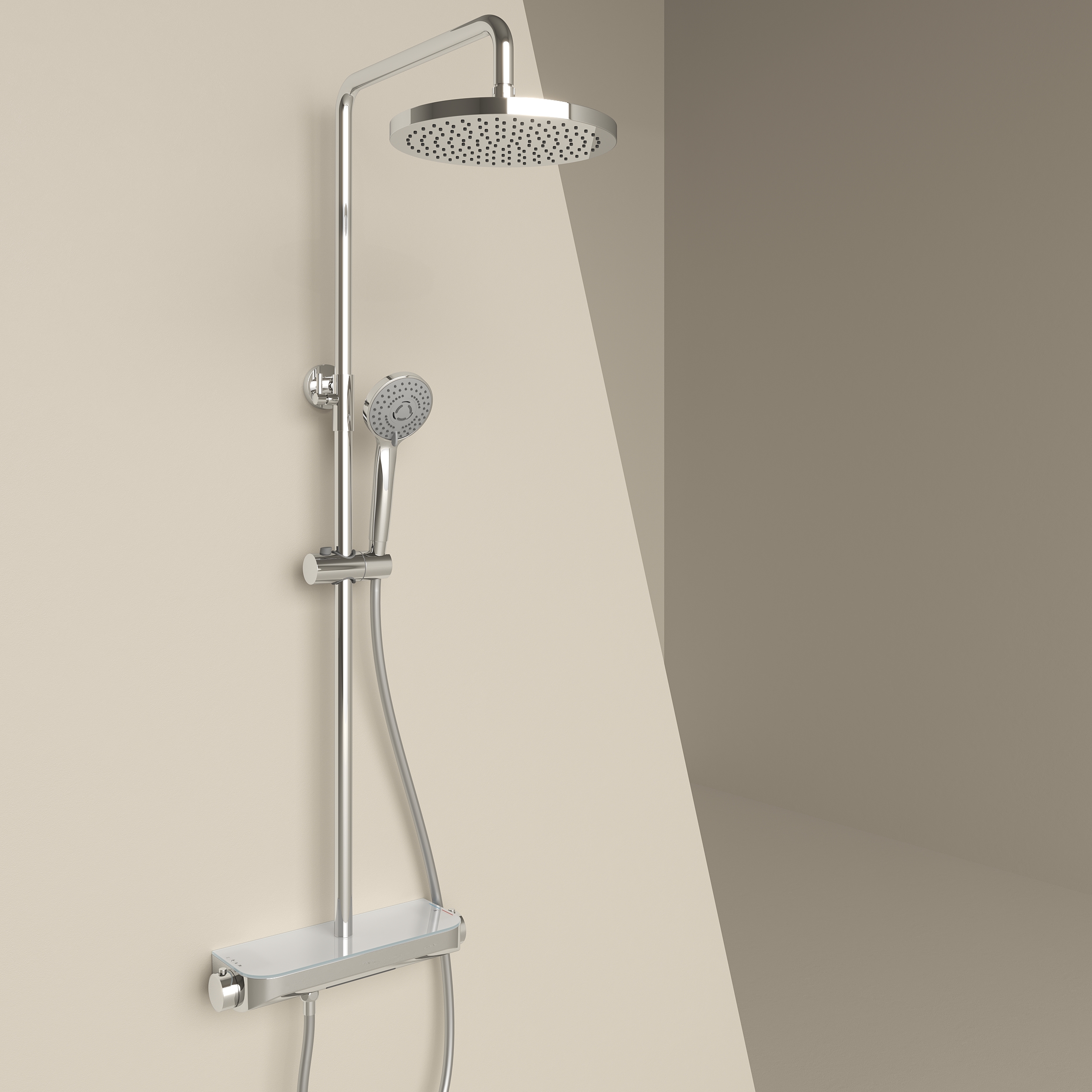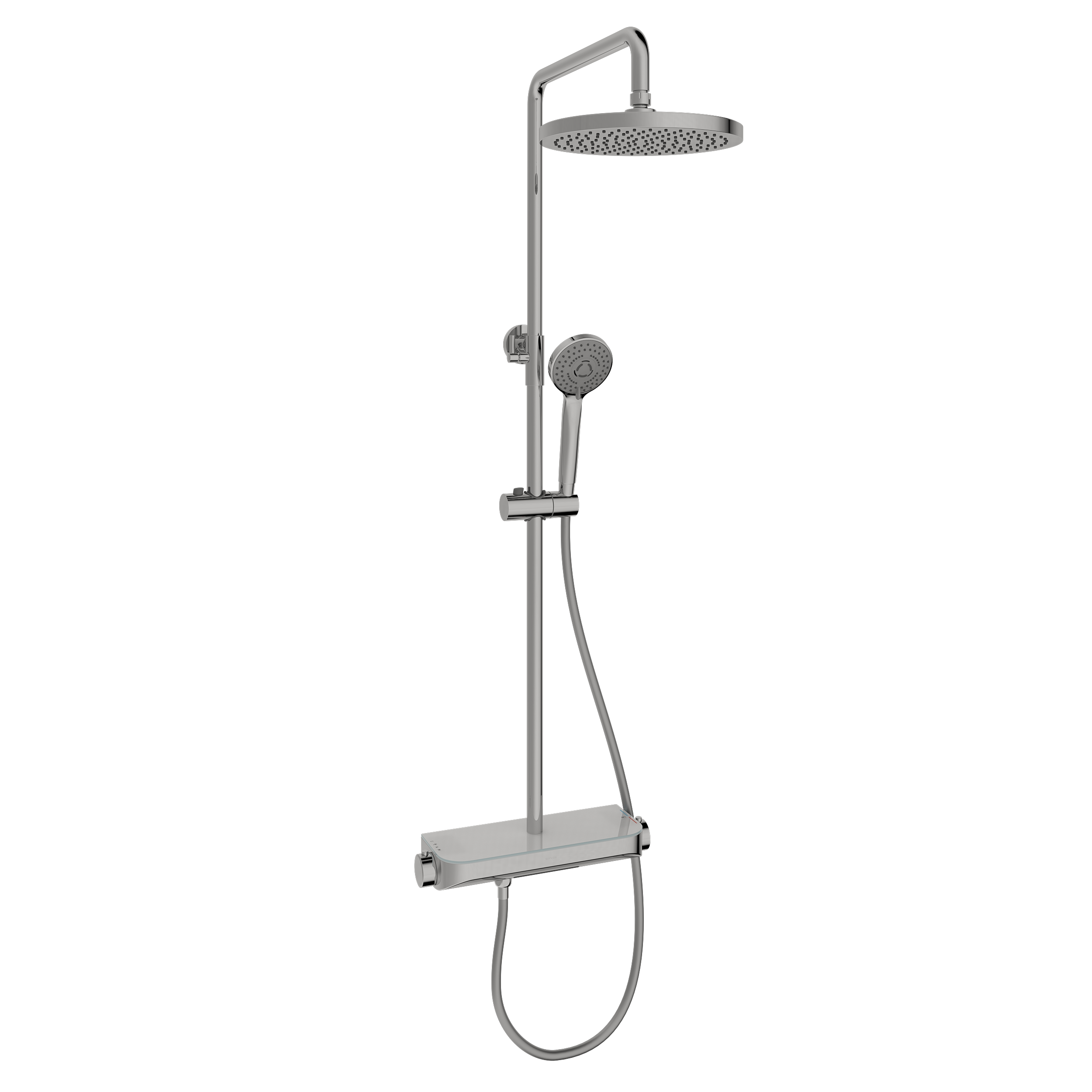 Душевая стойка Sancos Teo c термостатом, встроенным изливом, полкой и с регулировкой по высоте штанги, цвет хром, арт. SC11002CH