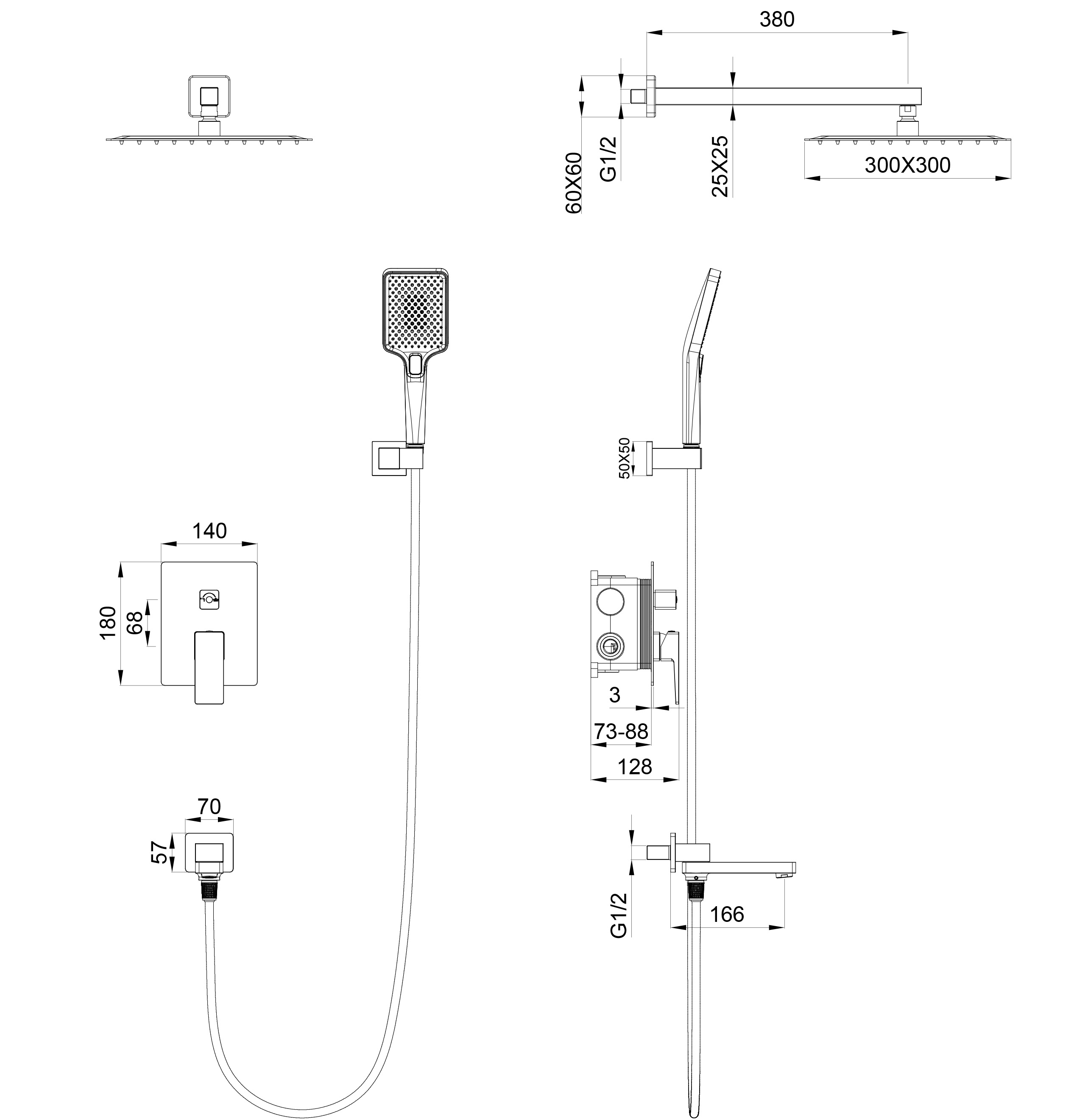 Душевая система встраиваемая wonzon & woghand cube 2.0, темный графит (ww-88939068-bgm)