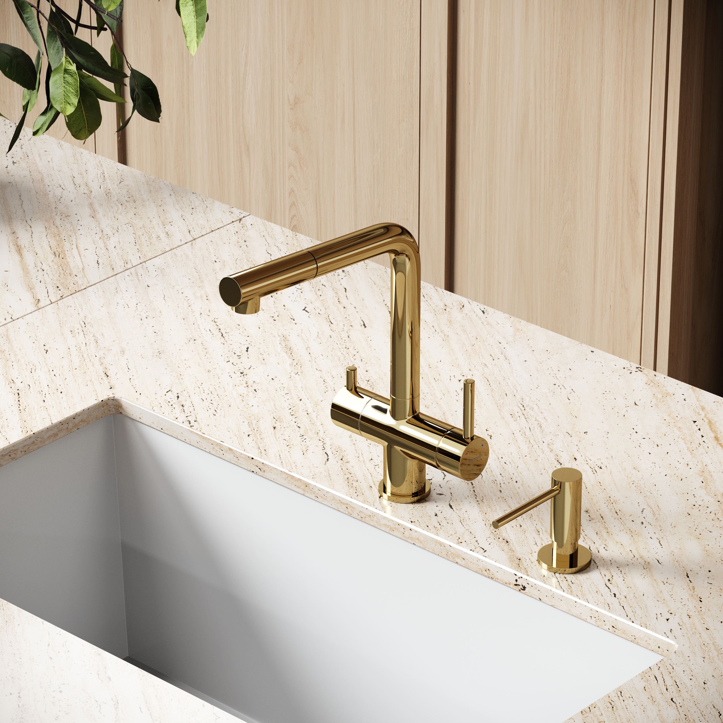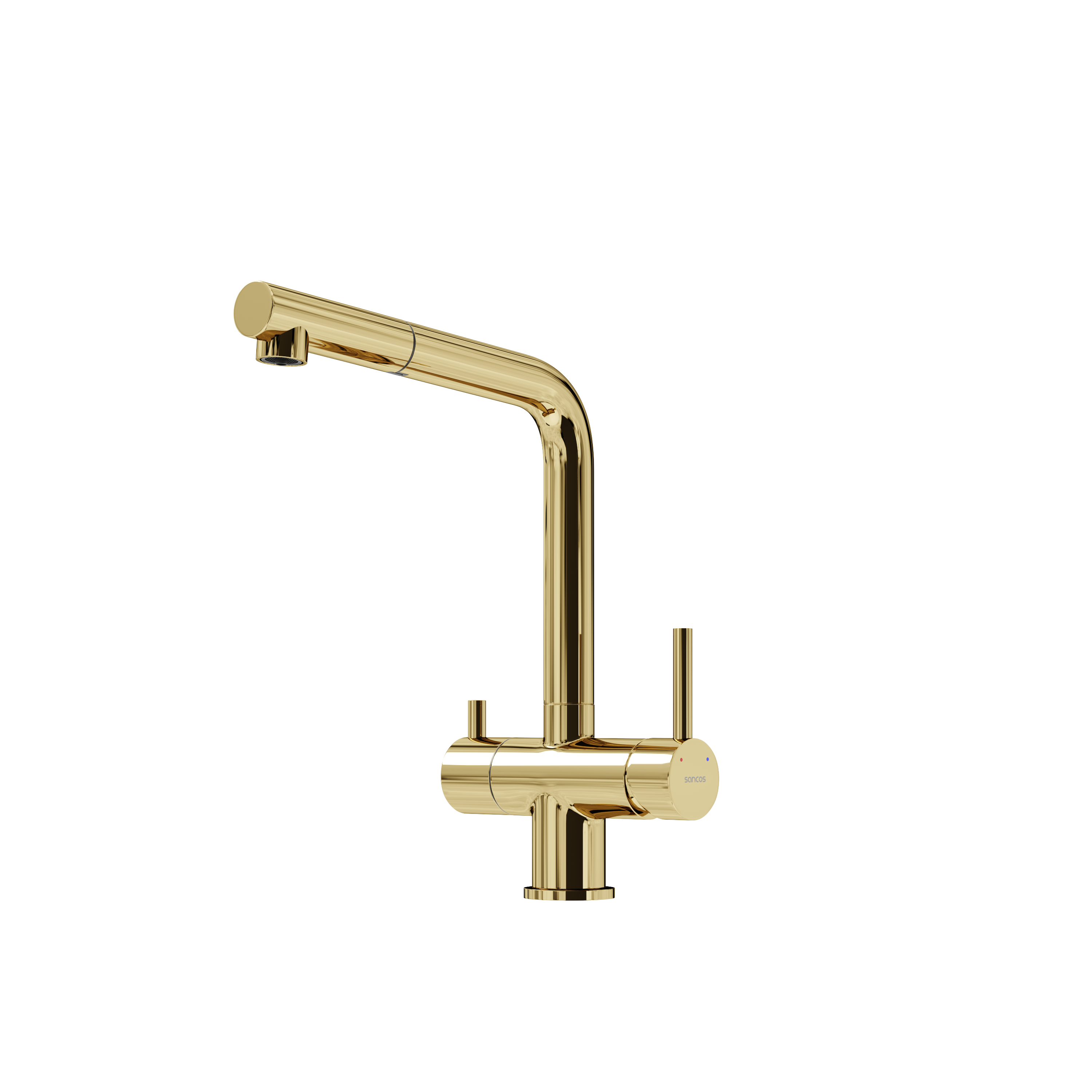 Смеситель для кухни SANCOS Spin с поворотным и вытяжным изливом, c краном для фильтрованной воды, цвет полированное золото, арт. SC4015ZG