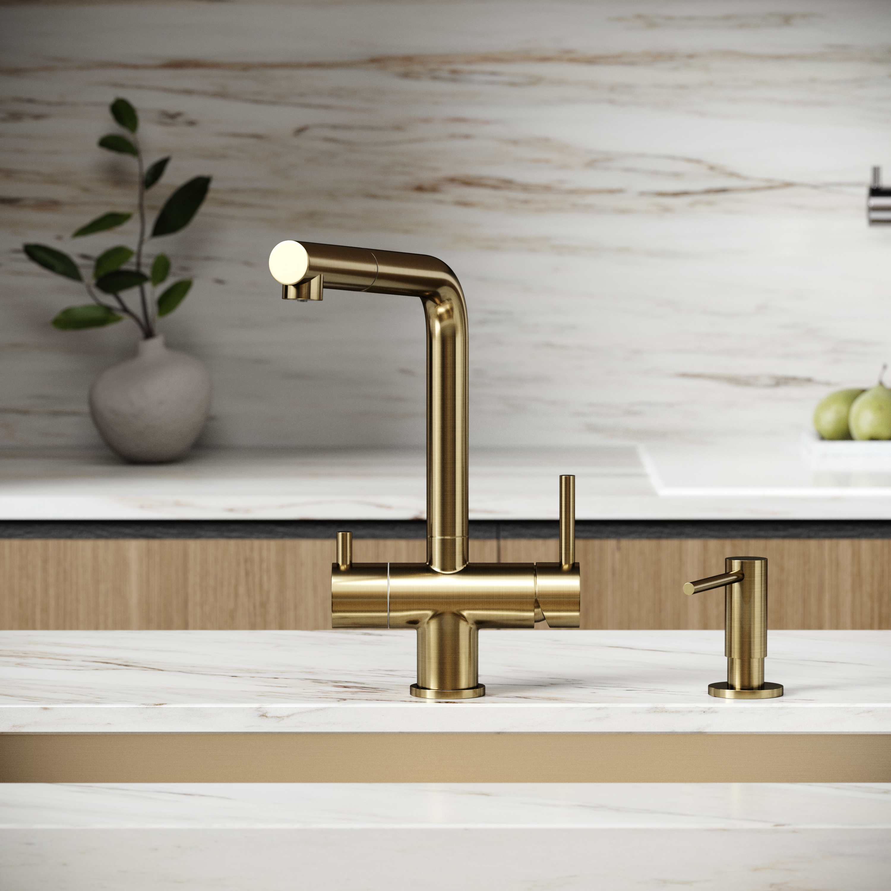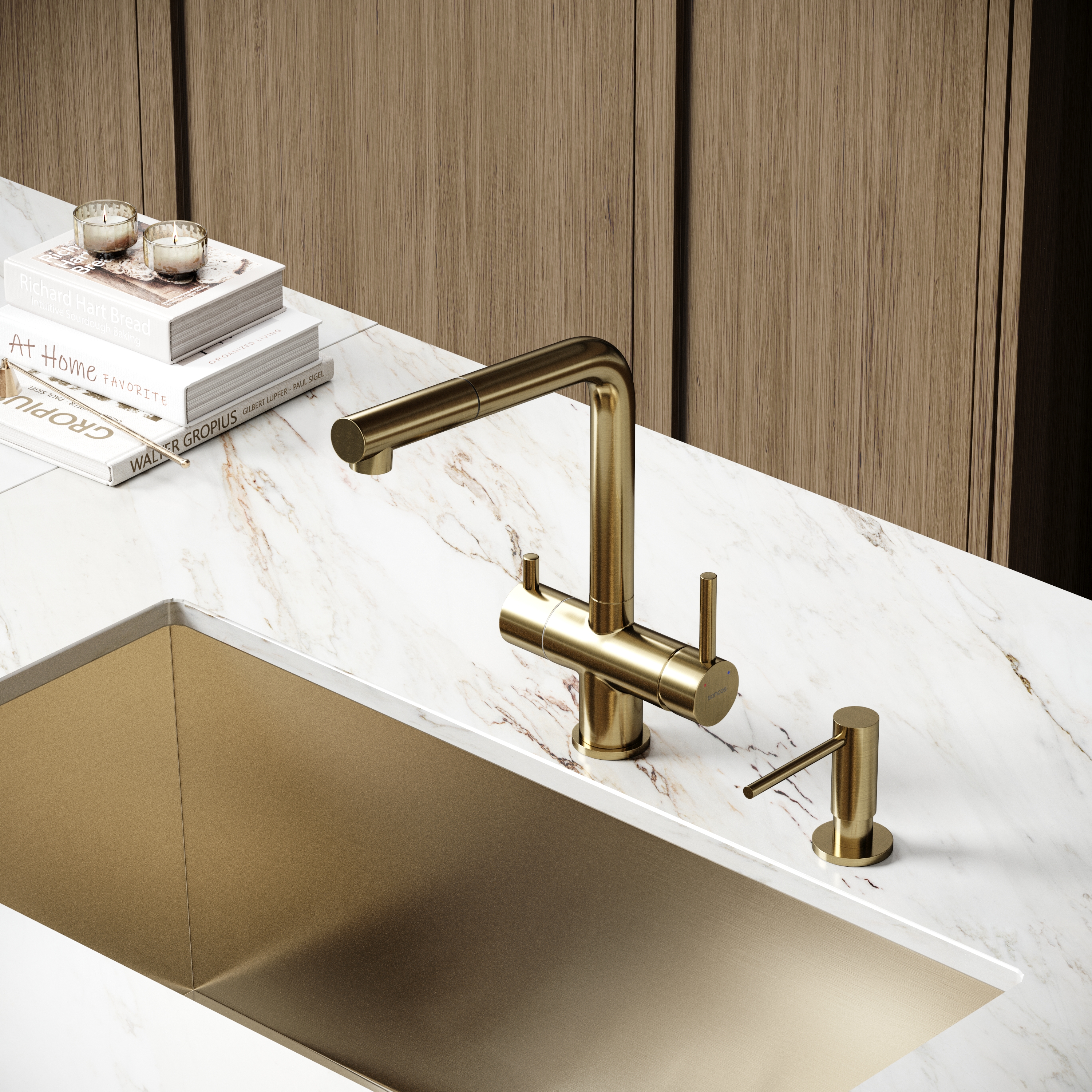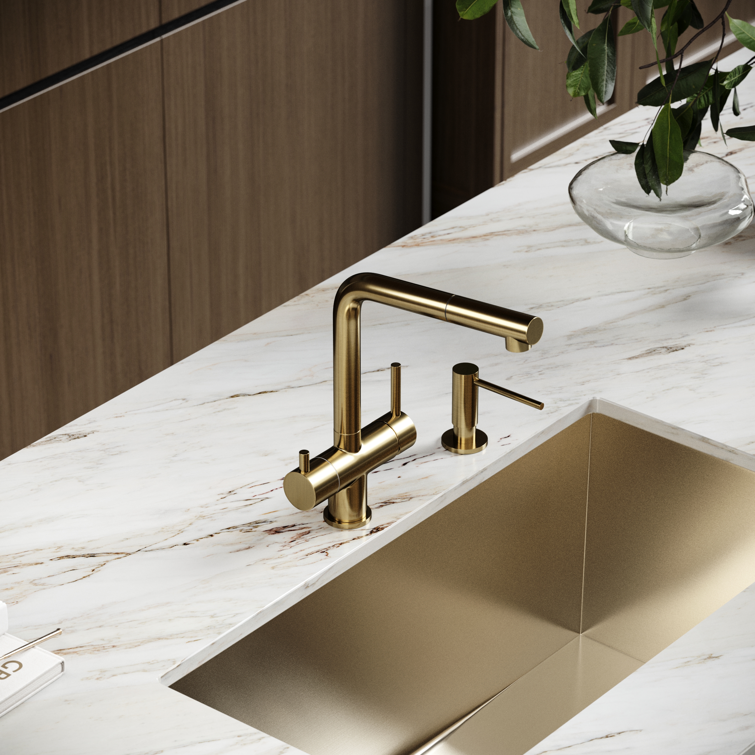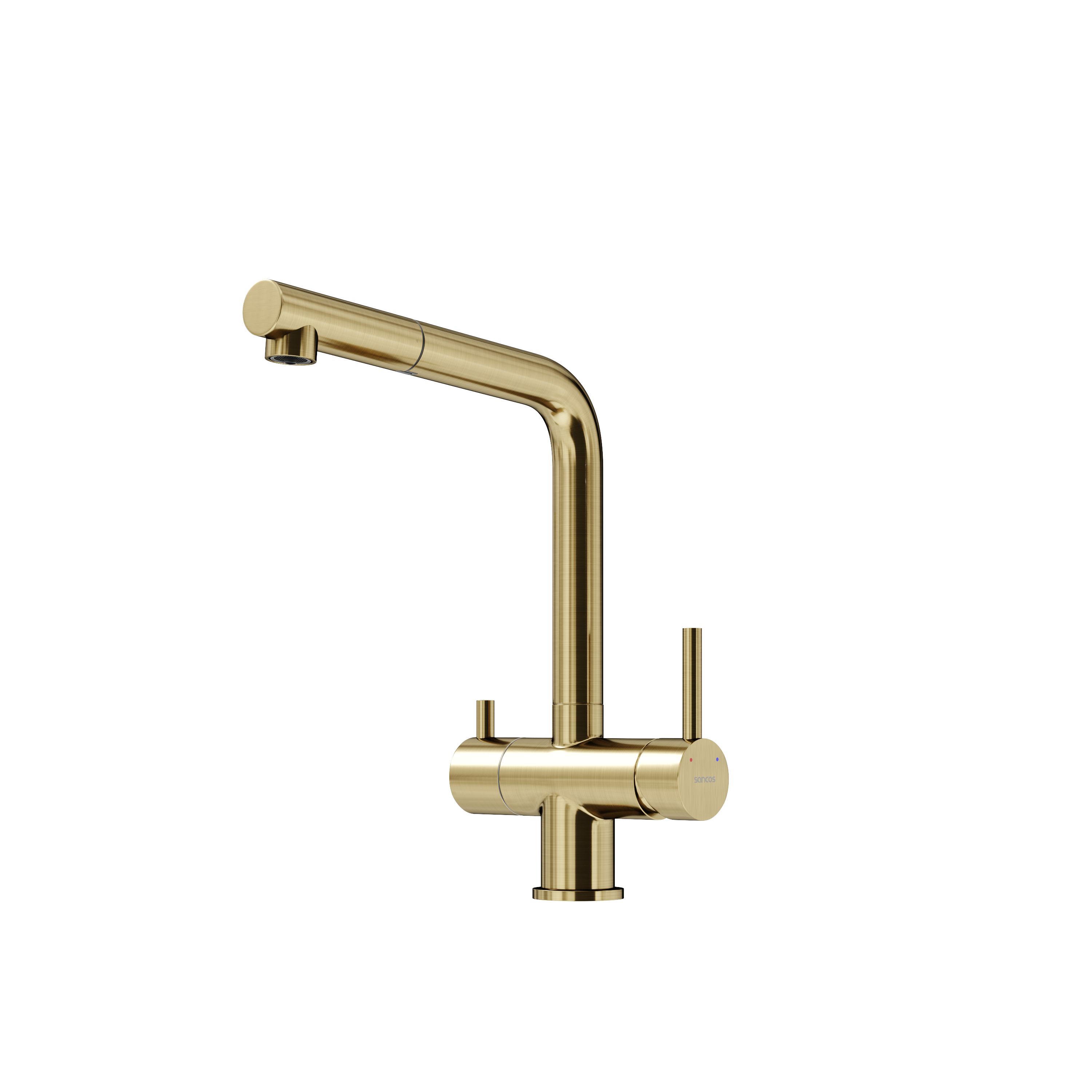 Смеситель для кухни SANCOS Spin с поворотным и вытяжным изливом, c краном для фильтрованной воды, цвет брашированное золото, арт. SC4015BG