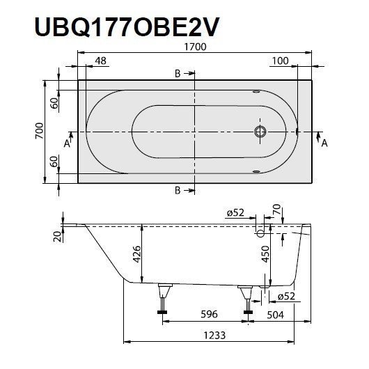 Ванна, Villeroy&Boch, Oberon, ширина, мм-1700, глубина, мм-700, высота, мм-450, водоизмещение (л)-135, форма-овальная, диаметр слива, мм-52, ножки-есть, материал-quaryl, цвет-белый