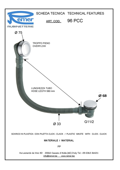Cлив-перелив для ванны пластик click-clack cr хром remer